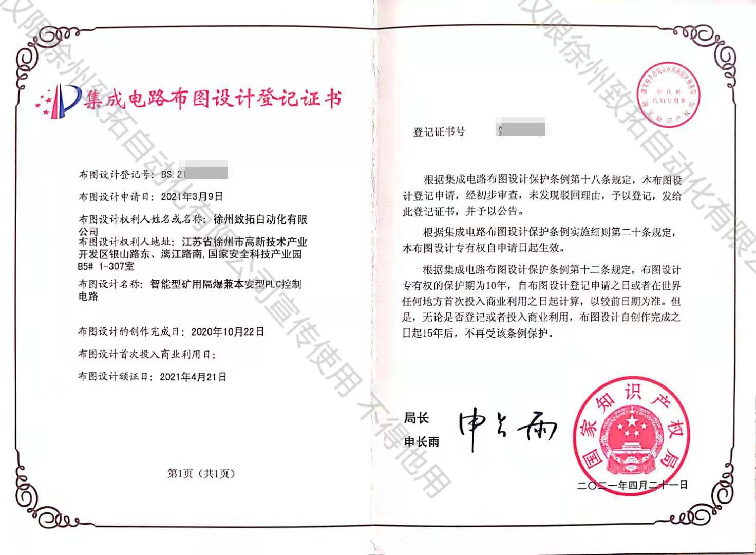 礦用隔爆兼本安型PLC控制電路設計登記證書